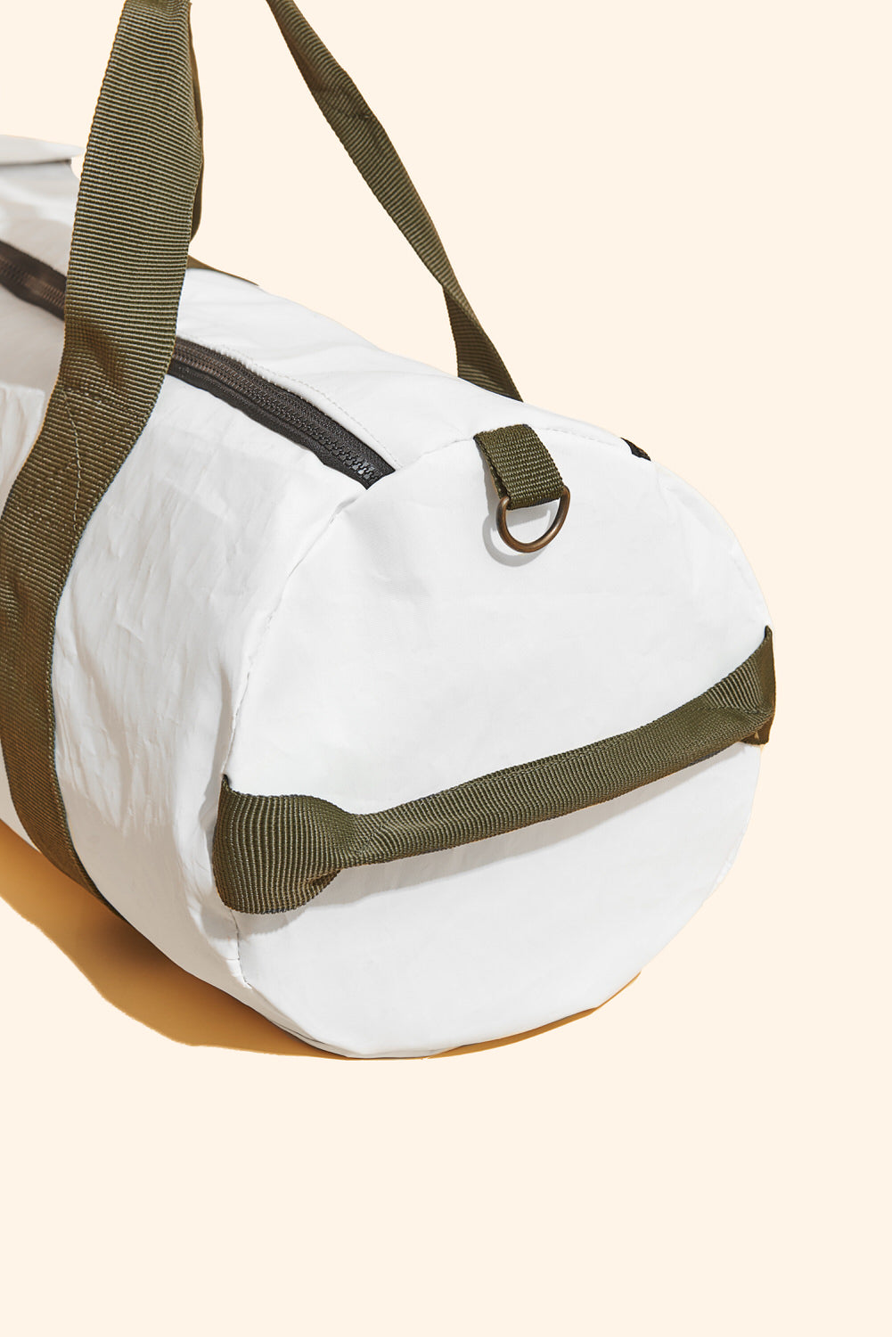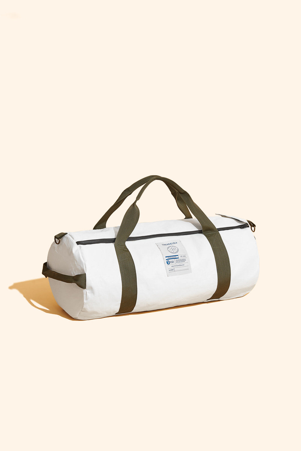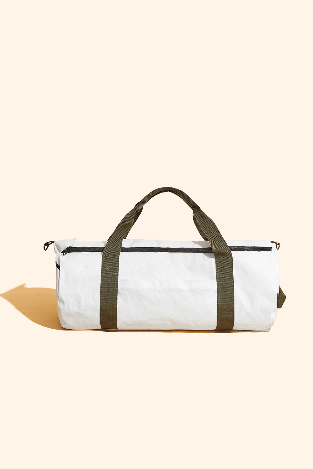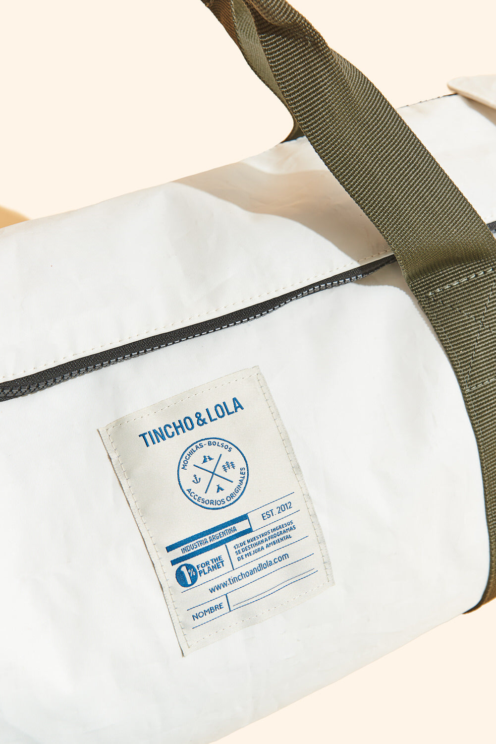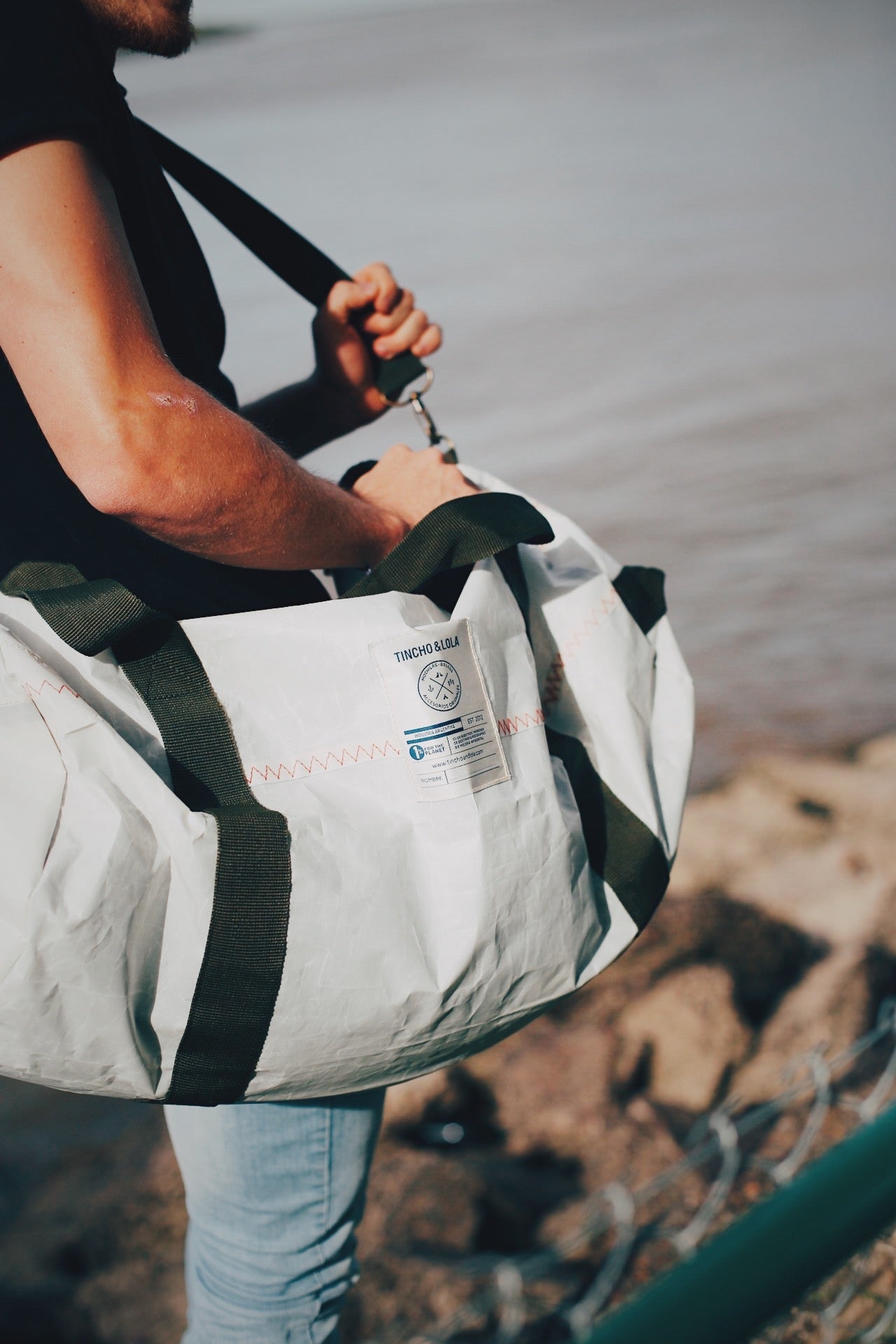 Duffle bag made of recycled Dacron sails. It has reinforced straps, a detachable carrying strap, metal hardware and closures, nautical rope zipper pulls, a zippered front pocket, a zippered glove compartment on one side, and a handle on the other. The lettering, patches and sail details on each bag is assorted.