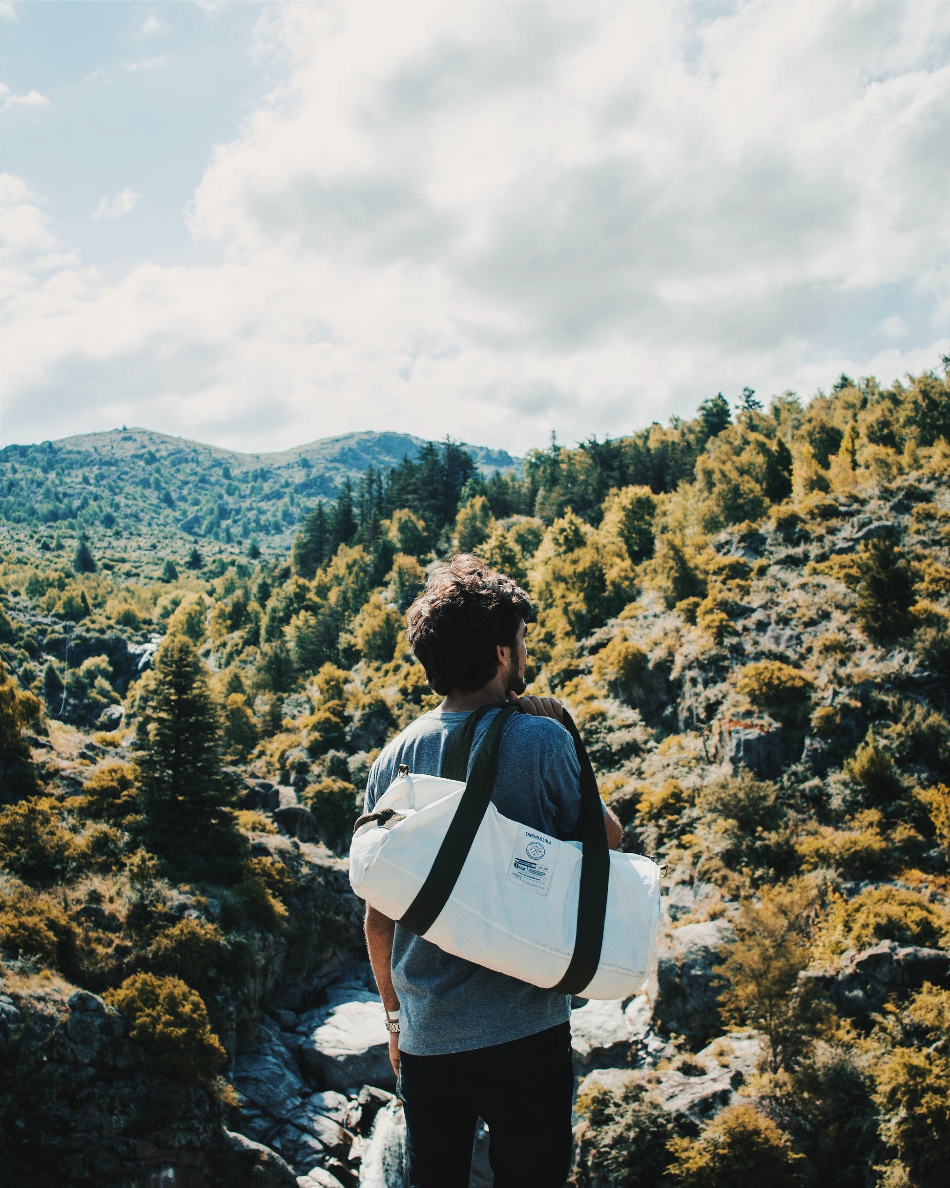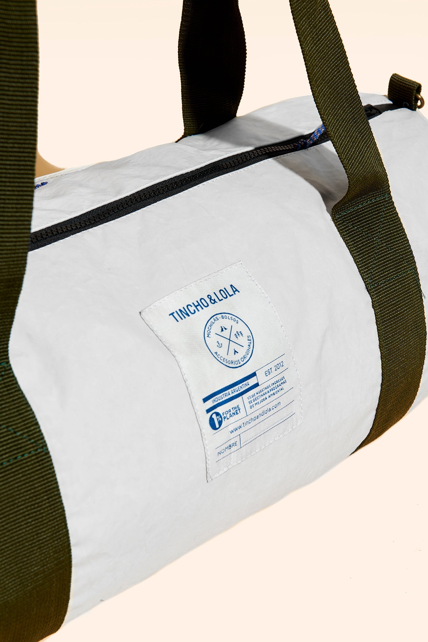 Duffle bag made of recycled Dacron sails. It has reinforced straps, a detachable carrying strap, metal fittings and closures, nautical rope zipper pulls, a zippered front pocket, a glove compartment on one side and a handle on the other. The lettering, patches and sail details on each bag is assorted.