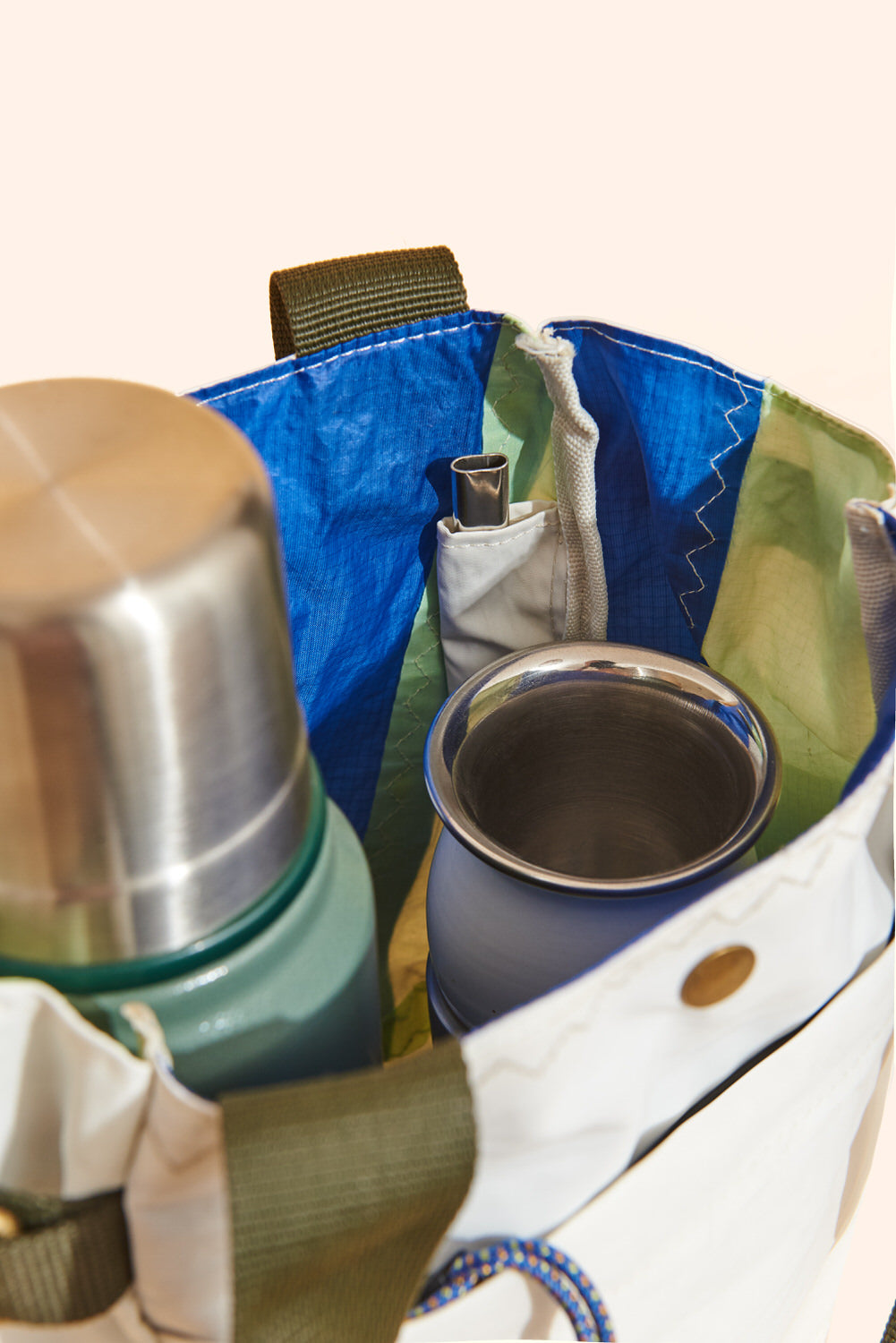 The Oberá Tote is ideal for carrying mate and food in outdoor activities such as the beach, mountains adventures, or picnics. It is a practical and resistant mate bag made with recycled boat sails. It has reinforced straps, a front pocket, two side glove compartments for bottles and thermoses, and a small interior pocket to carry the mate bombilla.